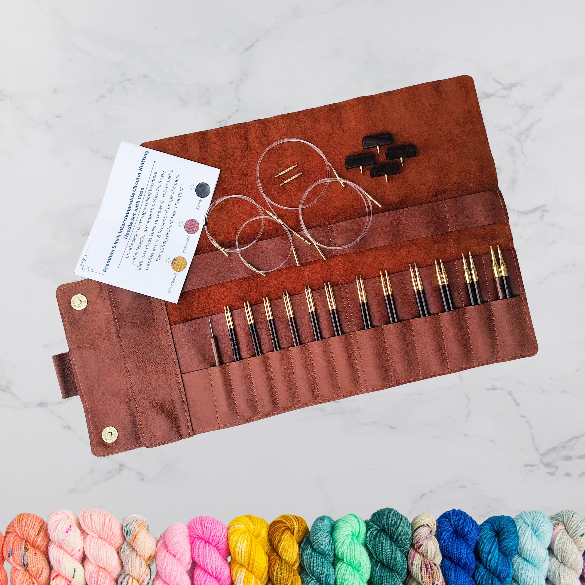 Included: Interchangeable Circular Knitting Needle Set Contains: (9 / 10) 3.5 / 5.0 Inch Needle Tip Sets: US Sizes: 3.5mm- 8.0mm / 9.0mm | 4 Connecting Cords: 16 in 24 in., 32 in., 40 in. | 4 Wood Stoppers | 1 Leather Carrying Case with Magnetic Internal Pocket and Strap Closure.